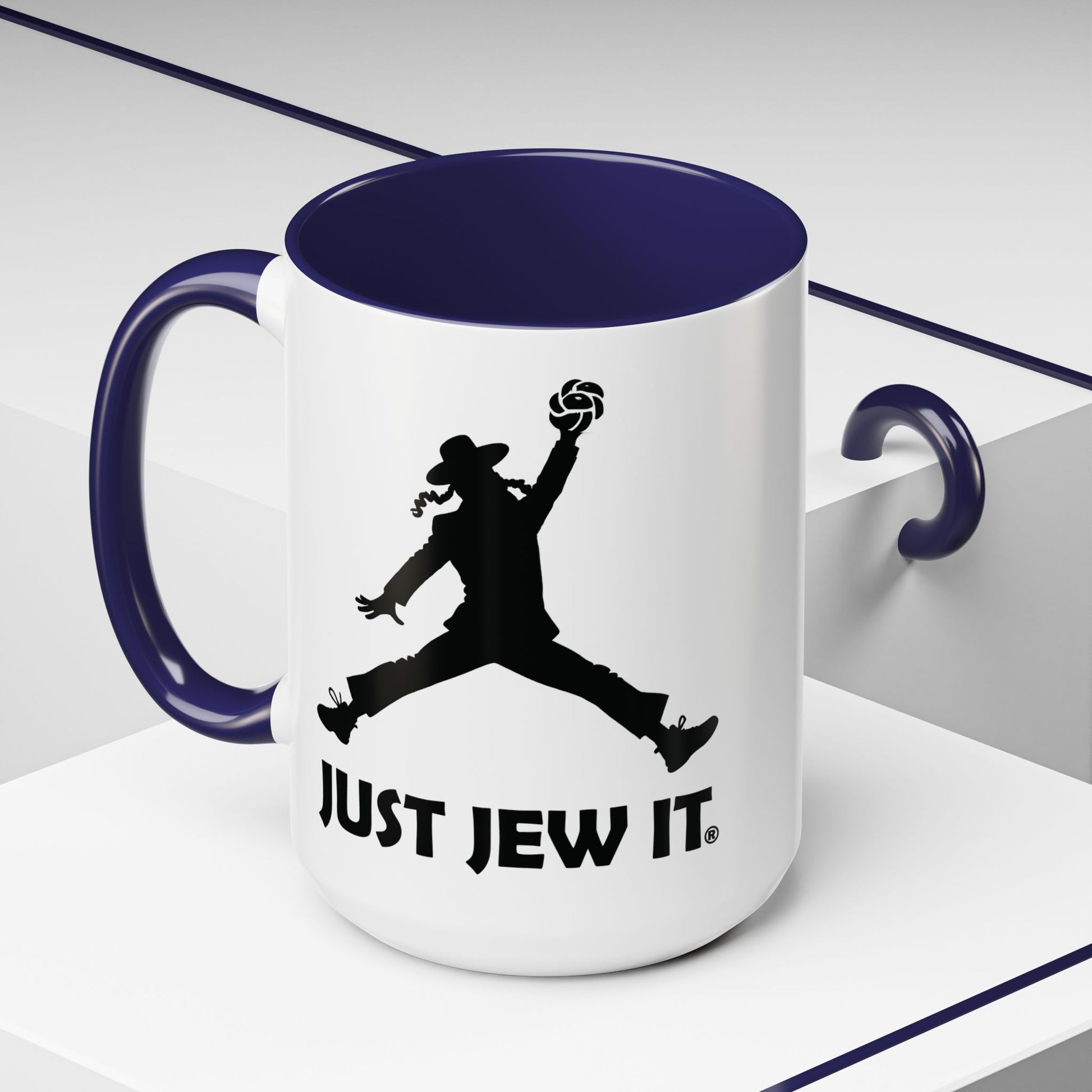 A humorous Just Jew It® Rabbi Dunking Challa Bread Accent Coffee Mug, perfect for coffee lovers with a sense of humor. This mug adds a fun and light-hearted vibe to your morning routine and is great for starting conversations. Ideal for those celebrating Hanukkah, Passover, or any Jewish holiday. Product features - Microwave and dishwasher safe - Vibrant colors and eye-catching design - Available in 15oz - Ceramic material with glossy finish - Lead and BPA-free Care instructions - Clean in dishwasher or wash by hand with warm water and dish soap.
